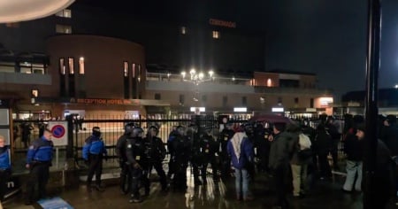 MENDRISIO - Due grossi striscioni bianchi con scritte rosse e nere: "L'odio non è un diritto!" e "No al fascismo". E ancora i tamburi e qualche petardo sparato all'arrivo anche dei molinari, che hanno provato inutilmente a sfondare, poco prima delle ore 20, il cancello che delimita la zona non accessibile; tra loro qualche partecipante a volto coperto.
