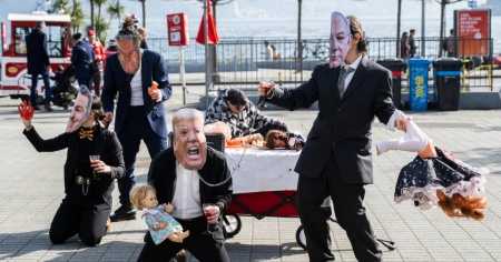 I partecipanti hanno sfilato in completo scuro, brandendo delle bambole, con indosso delle maschere rappresentanti il consigliere federale e ministro degli esteri Ignazio Cassis, il presidente USA Donal Trump, il premier israeliano Benjamin Netanyahu e il defunto criminale sessuale Jeffrey Epstein.