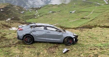UNTERSCHÄCHEN - Auto esce di strada mentre sale verso il passo del Klausen. Lunedì 3 giugno, per motivi ancora in fase di definizione, una vettura si è schiantata contro alcune pietre a bordo strada prima di volare nel ripido prato sottostante, ribaltandosi.
