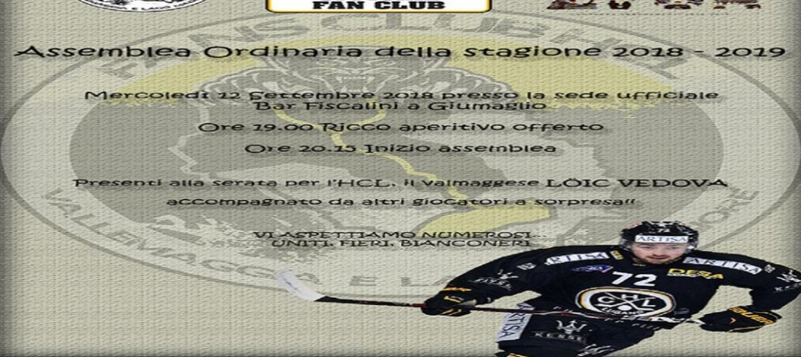 Come da consietudine anche quest'anno il Fans club HCL Vallemaggia e Lago Maggiore prima dell'inizio della stagione invita soci e simaptizzanti all'assemblea ordinaria prevista per mercoledì 12 settembre alle ore 20.15 presso la sede ufficciale del Bar Fiscalini di Giumaglio. Prima dell'assemblea a partire dalle 19.00 sarà offerta un ricco aperitivo. Durante la serata sarà a disposzione per scambi di autogarfi ed pensieri il giocatore Valmeggesse Löic Vedova con altre presenze a sorpesa. È gradita la riservazione entro il 7 settembre all'email fansclubhclvm@gmail.com