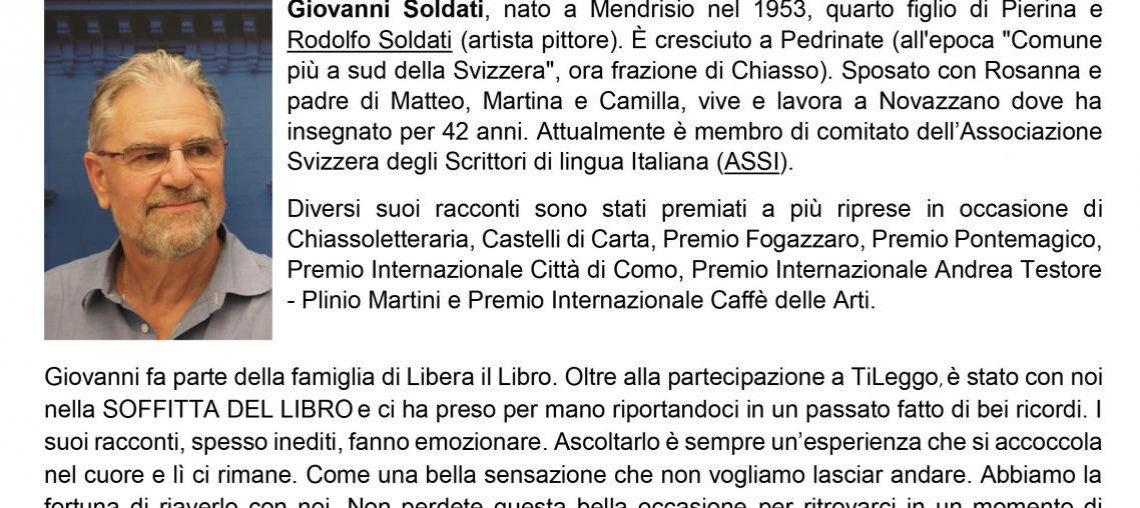 Giovanni Soldati, nato a Mendrisio, fa parte della famiglia di Libera il Libro. Oltre alla partecipazione a TiLeggo, è stato con noi nella Soffitta del Libro e ci ha preso per mano riportandoci in un passato fatto di bei ricordi. I suoi racconti, spesso inediti, fanno emozionare. Ascoltarlo è sempre un’esperienza che si accoccola nel cuore e lì ci rimane. Come una bella sensazione che non vogliamo lasciar andare. Abbiamo la fortuna di riaverlo con noi. Non perdete questa bella occasione per ritrovarci in un momento di condivisione, tra il profumo di castagne appena cotte!