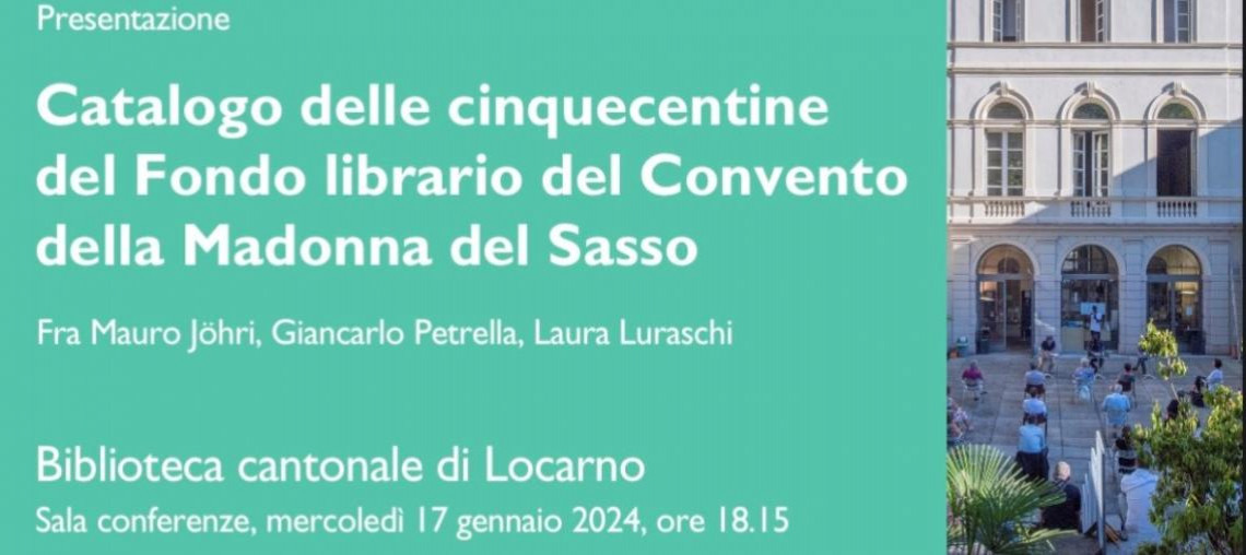 Il volume, pubblicato a Roma dall’Istituto Storico dei Cappuccini, indaga la storia della biblioteca del Convento della Madonna del Sasso a Orselina, offrendo il catalogo completo delle 505 edizioni del Cinquecento. Tali opere dicono molto delle persone e degli enti che le hanno possedute, in particolare – ma non solo – nel contesto delle realtà locarnesi soppresse a metà Ottocento: i conventi di San Francesco, della Madonna del Sasso dei minori conventuali e di San Rocco dei cappuccini. Intervengono Fra Mauro Jöhri, il Professor Giancarlo Petrella e l'autrice Laura Luraschi. Modera la serata Stefano Codiroli, Biblioteca cantonale di Locarno.