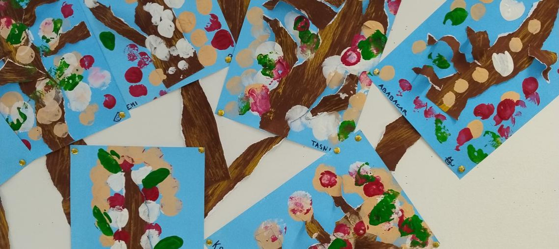 È primavera! Per festeggiare il suo arrivo creiamo un intreccio di rami e di fiori con timbri speciali prendendo spunto dal pittore Damien Hirst.
