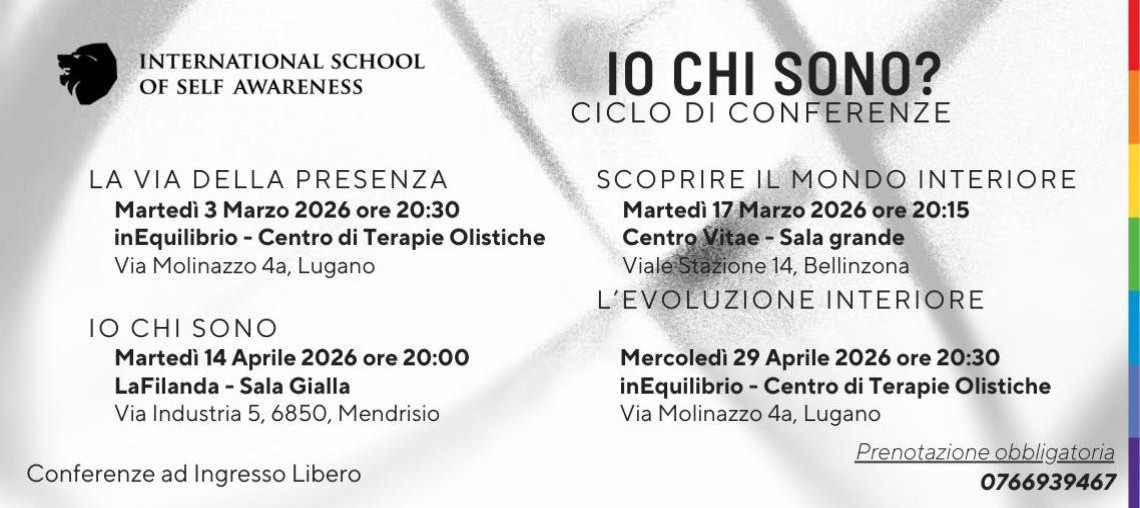 Per il ciclo di conferenze dal titolo "IO CHI SONO" proseguono gli appuntamenti, questa volta al Centro di Terapie Olistiche inEquilibrio a Lugano. Durante la conferenza verranno esposti gli stati interiori dell'uomo e le possibilità di sviluppo. Entrata gratuita, riservazione obbligatoria allo 078 234 73 93.