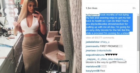 Dopo essersi scattata un selfie, Kylie ha svelato su Instagram: "Ho passato interi mesi senza toccare la tintura e a indossare delle parrucche per permettere ai miei capelli di tornare in forma. Ma adesso eccomi! Grazie a @priscillavalles @maishaoliver per esservi presi cura dei miei capelli per tutto il giorno! Per l'autunno sarò biondo-cenere".