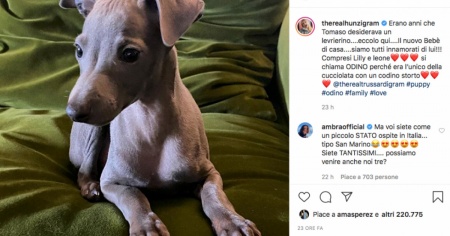 Il nuovo elemento della famiglia è stato presentato dalla Hunziker su Instagram con tutti gli onori: «Erano anni che Tomaso desiderava un levrierino… - spiega la presentatrice ai suoi follower - eccolo qui… Il nuovo bebè di casa… siamo tutti innamorati di lui!!! Compresi Lilly e Leone (ovvero gli altri cani della famiglia, due barboncini, ndr). Si chiama Odino perché era l’unico della cucciolata con un codino storto». Questo piccolo difetto, però, non avrà certo fatto calare il prezzo del piccolo Odino: i levrieri sono una razza nobile, il costo di un esemplare può variare tra i 1.000 e i 1.600 euro in base al pedigree.