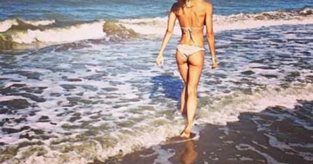 L’attrice si esibisce sulla spiaggia di Riccione con un micro bikini.
