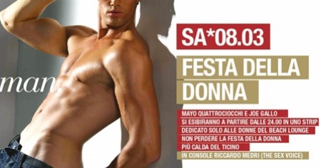 Festa della donna! Dalle 22.30: la Hot Disco Music. In console Riccardo Medri, the hot vocalist. Ospiti della serata: Mayo Quattrociocchi e Joe Gallo, si esibiranno in uno strip dedicato solo alle donne del Beach Lounge. La festa della donna più calda del Ticino!
