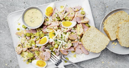 - Insalata: mescolare i cervelas e tutti gli ingredienti fino al gruyère compreso con la salsa. Distribuire l’insalata nei piatti, posarvi sopra le uova. Servire con il pane di fiocchi d’avena.