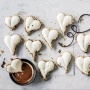 - Cuori: trasferire il composto in un sac à poche con beccuccio liscio di ca. 16 mm di Ø e formare 16 cuori su una placca foderata con carta da forno.