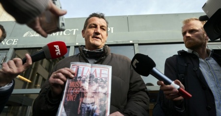 Fikret Alic, con una copia del Time dell'epoca in mano, era fuori dal tribunale speciale dell'Onu