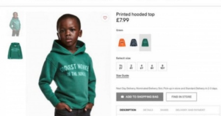 STOCCOLMA - H&M ha provocato uno scandalo sui social network in occasione del lancio della sua nuova collezione per bambini. Il marchio svedese ha scelto di far indossare a un bambino di colore una felpa con cappuccio e una scritta sul davanti. Il messaggio in questione? «La scimmietta più cool nella giungla». Indignati, molti utenti della rete hanno preso questa immagine come razzismo ordinario e hanno attaccato la catena d’abbigliamento. Lo riferisce l’Huffington Post.
