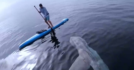 LOS ANGELES - Incontro del tutto inaspettato per 2 giovani sportivi di Laguna Beach in California. Mentre stavano pagaiando sulle loro tavole, gli si avvicina un enorme pesce luna, che incuriosito si ferma a osservarli.