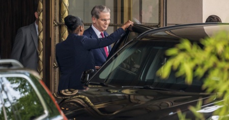 Il segretario del Tesoro Scott Bessent mentre si reca al meeting con la controparte cinese a Ginevra.