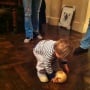 In una delle foto si inginocchia di fronte al bambino mentre quest'ultimo gioca con la palla a forma di seno e con tanto di capezzolo, e sembra che se la lancino a vicenda. Un'altra foto li mostra insieme su un divano. L'identità del bambino è sconosciuta.
