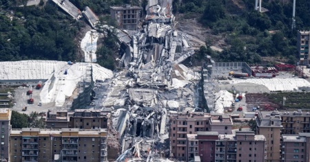 14 AGOSTO 2018: IL CROLLO. Alle 11.36 una sezione di circa 200 metri, comprendente la pila 9, del viadotto Polcevera, crolla. Sono 43 i morti, 16 i feriti, 566 gli sfollati dalle case sotto il ponte.