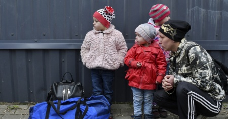 Keystone/ AP (ANDRIY ANDRIYENKO)Anastasia copre le sue figlie Anna, 2, in centro, Nadezhda, 5, a sinistra, e Sofia, 6, mentre si nascondono dietro un edificio dopo aver sentito dei bombardamenti durante l'evacuazione di civili in una stazione degli autobus a Kramatorsk, Ucraina.Cinque bimbi uccisi da trappole con ordigni a Trostianets
