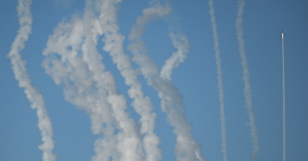 I giornalisti presenti a Pingtan, l'isola cinese più vicina alla terraferma di Taiwan, hanno visto una salva di razzi esplodere in aria lasciando scie di fumo bianco.