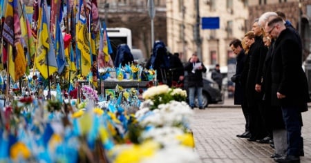 KIEV - Una lunga, lunghissima fila di bandiere, candele, foto dei soldati caduti. Di fronte, Volodymyr Zelensky e il gruppo di leader europei arrivati a Kiev, pronti a onorare per il quarto anno consecutivo la resistenza ucraina. È finita da alcuni minuti la cerimonia in onore dei caduti a piazza Maidan, simbolo della rivoluzione ucraina del 2014 e, più in generale, della resistenza al nemico russo.