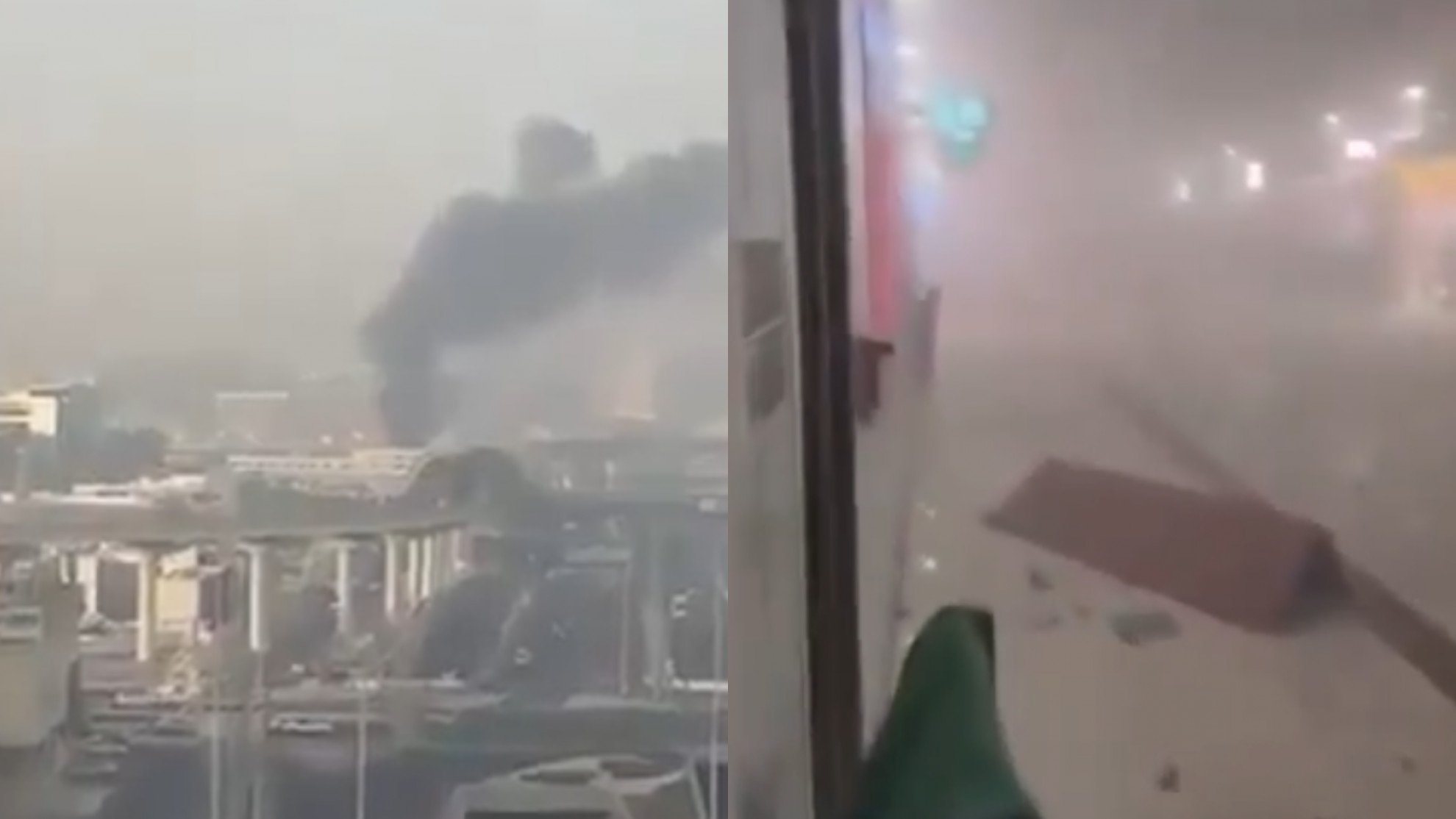 XIn lontananza si vede del fumo nero provenire dall'aeroporto di Dubai colpito da un missile iraniano.