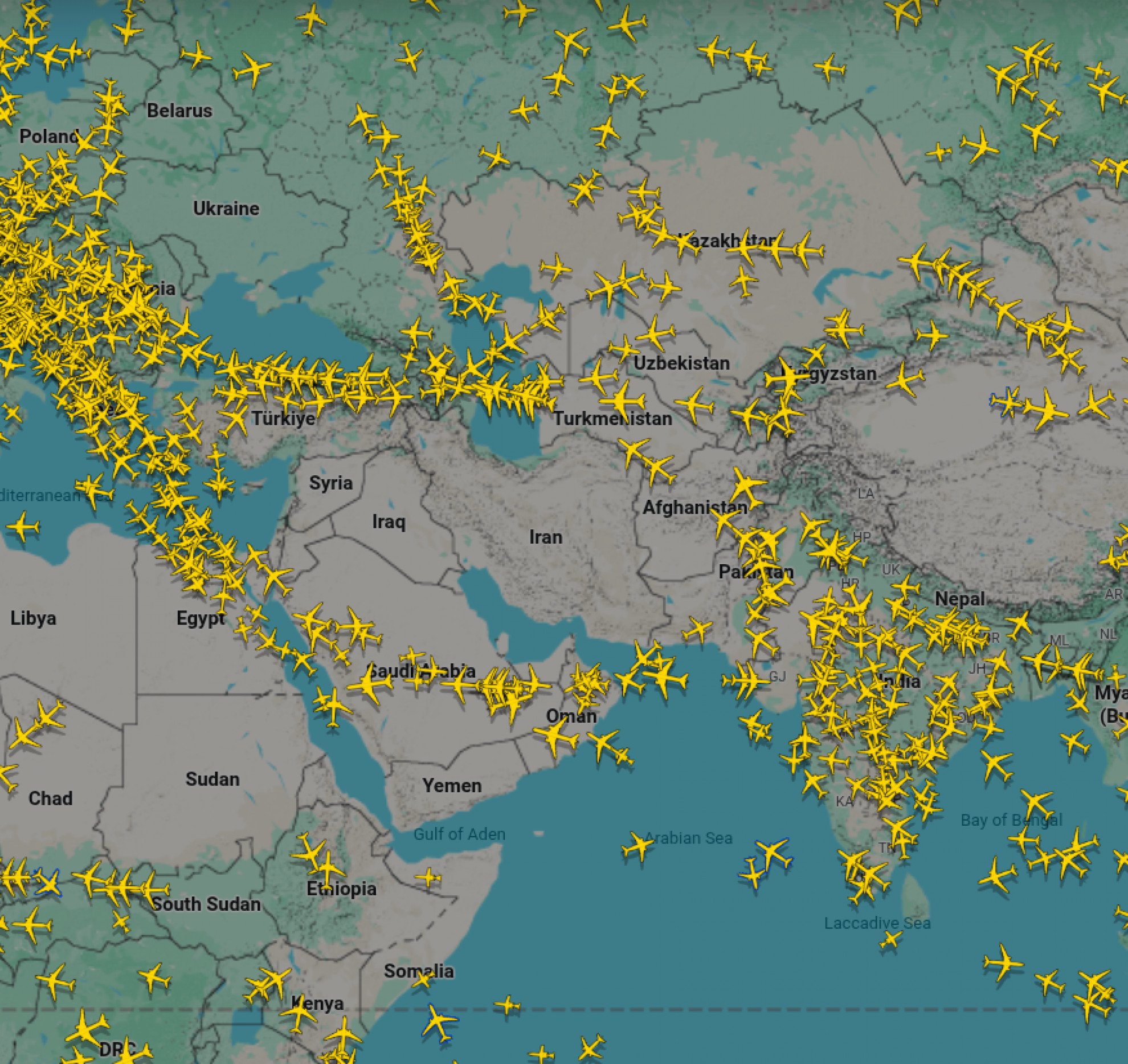 Flightradar24Gran parte dello spazio aereo del Medio Oriente è rimasto chiuso.