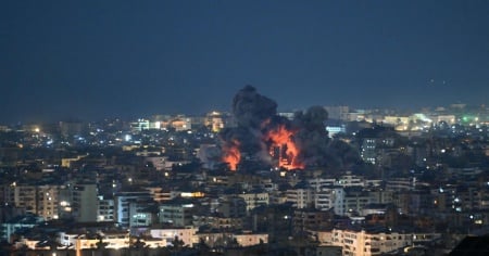 AFPFiamme e fumo si sollevano nel sud di Beirut, dopo un raid israeliano contro gli uffici di Al-Manar, l'emittente televisiva affiliata a Hezbollah.