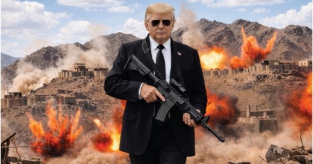 Il post, pubblicato quando a Washington sono le 4 del mattino, è accompagnato da un'immagine evidentemente generata dall'intelligenza artificiale che lo ritrae mentre impugna una mitragliatrice in piedi di fronte a una catena montuosa sconvolta dalle esplosioni.