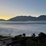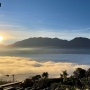 Aprendo la finestra, al posto di vedere l'acqua e la vegetazione a tinte autunnali, si è infatti ritrovato con un tappeto di nuvole sotto di sé. Che combinato a un cielo finalmente terso hanno regalato un'alba da ricordare.