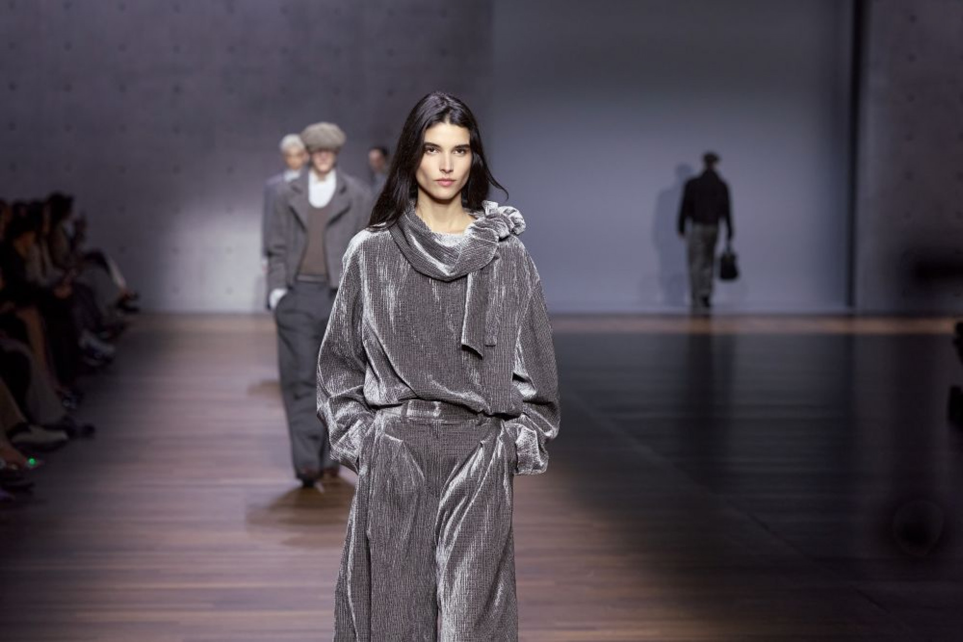 Paolo Oldani, Fashion Product Manager, ha premiato la sfilata di Armani Fall/Winter 26/27, elogiandone “la classicità sofisticata e la conoscenza profonda dei materiali”. Oldani ha sottolineato in particolare “i pantaloni ampi, morbidi di lane cashmere – una consuetudine per una collezione raffinata che esprime l’anima della città metropolitana – le giacche maschili in flanella, gli abiti lunghi, usati come tuniche in crepe”. Nella collezione si ritrova la cartella colori iconica della celebre griffe: “grigio, un must per Armani, poi salvia e blu per la seta e un colore magico, il bordeaux: Silvana Armani, credo abbia interpretato al meglio il Maestro!”.