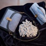 La tradizione del ricamo emerge con forza anche nelle creazioni di Daniele Amato, visitato per The Everlasting People da Chiara Pellicini e Tiziana Sartorio. Amato trasforma il ricamo nel capitolo più narrativo della sua collezione, dove mondi diversi prendono vita sulla superficie delle borse. In “Nightblooming”, su raso nero, sbocciano fiori notturni che si aprono solo al calare del buio, mentre gli agenti atmosferici trovano spazio e valore in “Clouds” e “Rain”, entrambi realizzati su velluto: soffici nuvole tridimensionali di cotone e una cascata di pioggia argento trasformano il cielo notturno in un mare incantato.