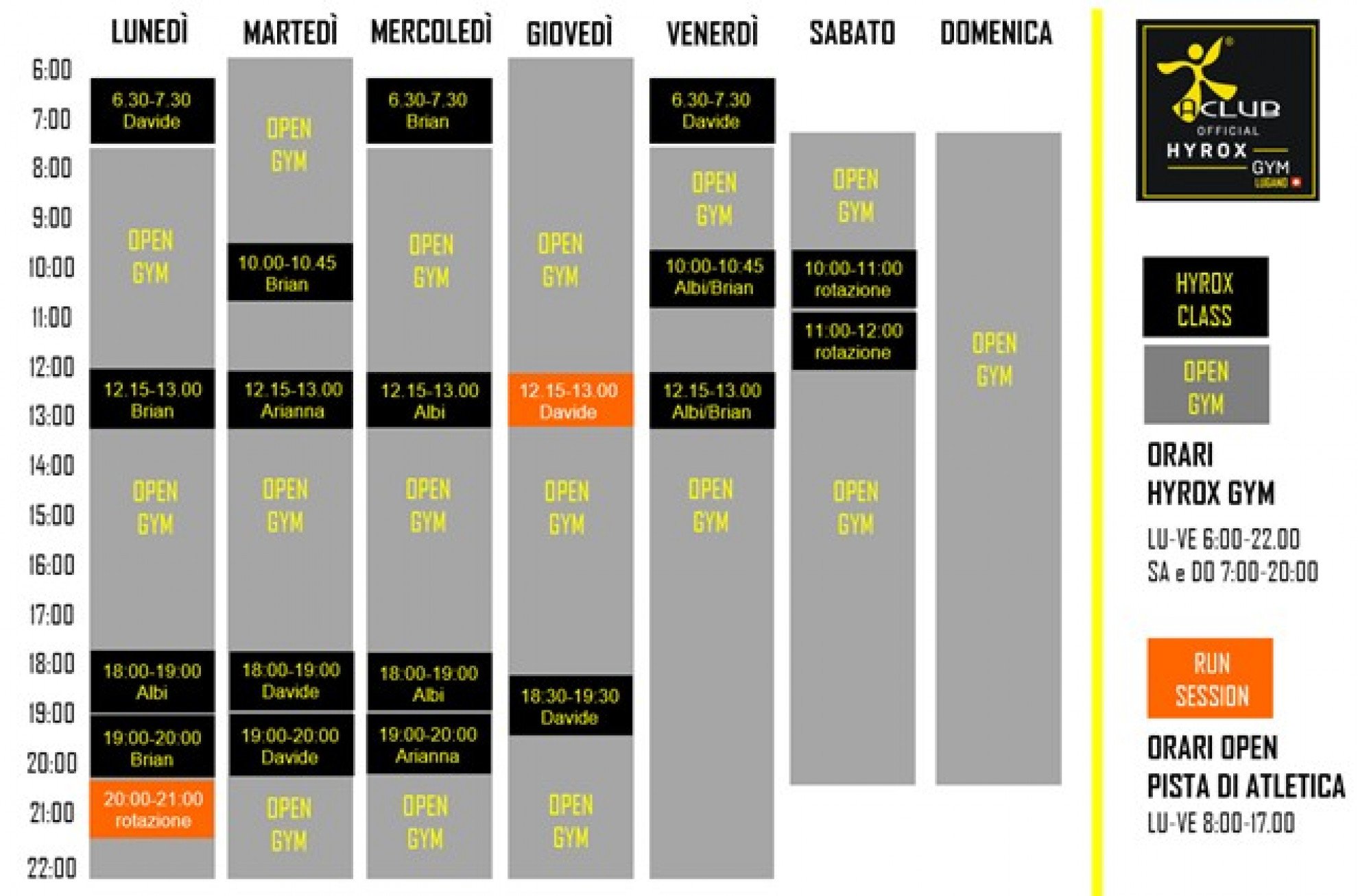 Solo ad A-CLUB puoi trovare uno spazio di oltre 400mq attrezzato per i tuoi allenamenti HYROX sia nella formula “Open Gym” che classi (LU-VE dalle 6.00 alle 22.00 / SA e DO dalle 7.00 alle 20.00), 18 classi alla settimana, in diversi orari della giornata. Una pista di atletica a tua disposizione (da LU a VE dalle 8.00 alle 17.00) con programmi di allenamento specifici per migliorare la corsa.