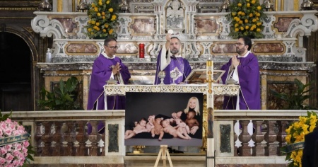 Frate Simone Castaldi ha introdotto con le seguenti parole la cerimonia: «Il dolore è tanto, la retorica sarebbe una facile scappatoia, ma Raffaella ci salverà dalla retorica. Lei è stata tante cose ma retorica mai». «Chissà se ci si rende conto di quanto sono importanti gli artisti, quanto fanno bene alla gente. In cielo sarà una festa ritrovarsi tutti insieme e proprio perché sarà una festa, sono sicuro che troveremo Raffaella lì, in prima fila».