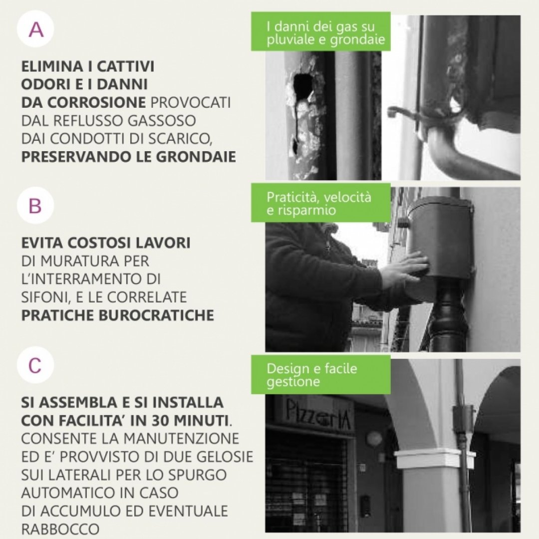 Syfi è un dispositivo a sifone per tubo pluviale esterno che: