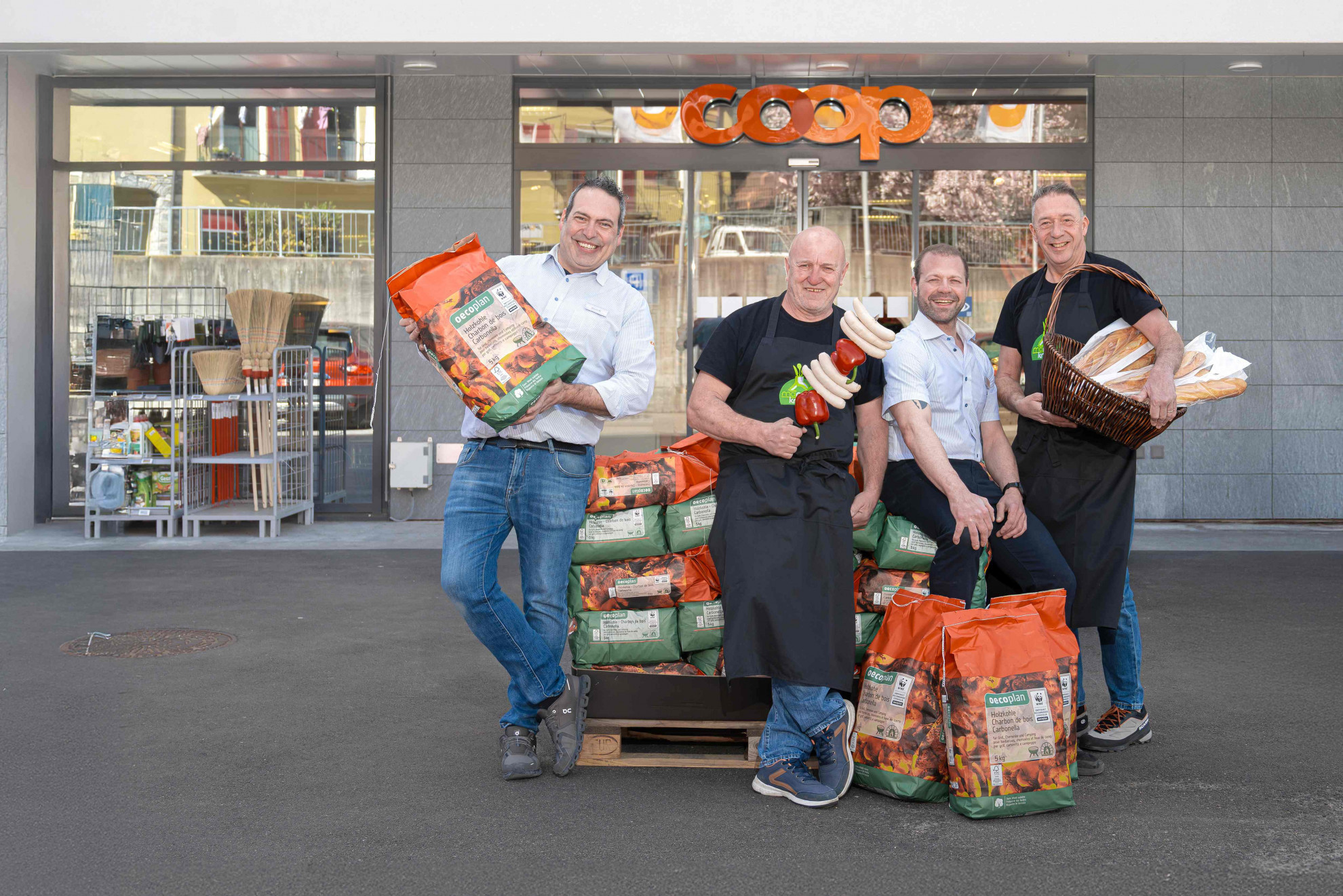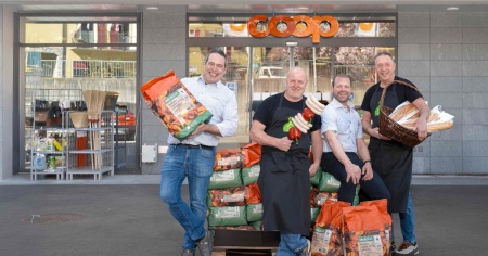 Ti-pressIn foto: Gerente e vice della Coop di Maggia, Daniele Muntoni e Simone Imperatori, Roberto Lafranchi e Christian Zingg, dell’associazione Manggia km0.Il punto vendita si conferma così anche come luogo di incontro e socialità, fortemente integrato nella vita della comunità.
