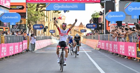 AGRIGENTO - Diego Ulissi ha vinto la seconda tappa del Giro d’Italia 2020, la Alcamo-Agrigento di 149 km. Sprintando sull'ultimo strappo, l’italiano dell’UAE Team Emirates ha preceduto Peter Sagan e Mikkel Honoré. Quarto e quinto posto rispettivamente per Matthews e Wackermann.