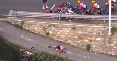 Per tentare di evitare le avversarie a terra, la veneta ha perso il controllo della sua bicicletta, scavalcando suo malgrado un guard-rail e precipitando per diversi metri oltre un muretto. Nonostante spaventoso incidente, ripreso in diretta, la professionista è sempre rimasta cosciente. È stata immediatamente soccorsa e, al momento, si trova in ospedale per gli accertamenti del caso.