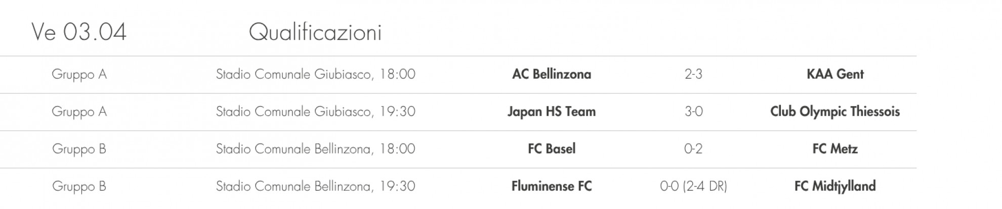 Il programma odierno - La terza giornata prevede altre quattro partite. Alle 16.00 di oggi sono programmate Fluminense-Metz (a Lodrino) e Japan HS Team-Gent (a Biasca). Alle 17.30 andranno invece in scena Midtjylland-Basilea (a Lodrino)e Club Olympique Thiessois-Bellinzona (a Biasca).