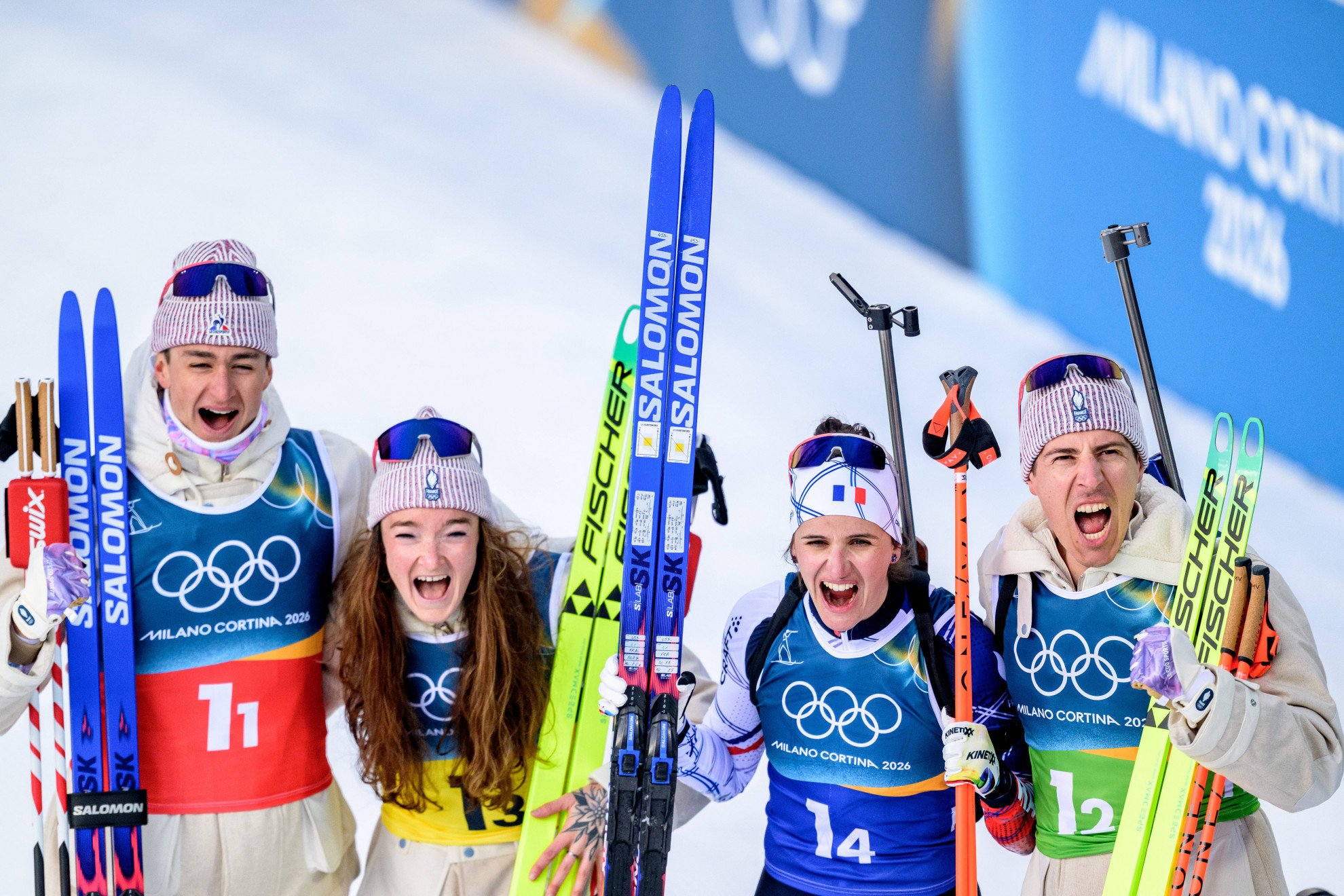 ImagoEric Perrot, Lou Jeanmonnot, Julia Simon e Quentin Fillon Maillet festeggiano l'oro nel biathlon.