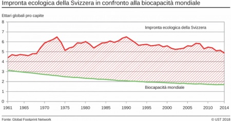 Secondo l'Ufficio federale di statistica, la maggior parte dei Paesi industrializzati necessita più di due pianeti. L’impronta ecologica misura il consumo di risorse naturali e mostra la superficie totale necessaria per la produzione di tali risorse. Questo indicatore mostra quale quantità di superficie per la produzione sarebbe necessaria a una regione, un Paese oppure all’intera umanità per soddisfare il proprio fabbisogno e smaltire i rifiuti prodotti. Permette quindi di valutare se l’utilizzo delle risorse naturali sia sostenibile o meno.