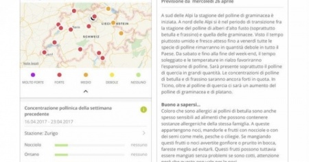 Presenza di pollini sott'occhio - Quando si apre «Pollini-News» sullo smartphone, appare una cartina svizzera con la concentrazione pollinica attuale nelle varie regioni. Basta toccare una località per verificare la presenza specifica di pollini. Chi soffre di raffreddore da fieno sa dunque immediatamente quanti pollini di un tipo di pianta ci sono in un determinato luogo. L'applicazione propone anche una previsione generale per i giorni a venire.