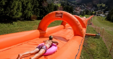 MORGINS - Secondo gli organizzatori si tratta del «più lungo, più veloce e più ripido» scivolo d’Europa. “Splash Your Mountains” è arrivato venerdì a Morgins (VS) e ci resterà fino al 6 agosto. La pista, lunga 315 metri, permette ai più avventurosi di raggiungere velocità vicine ai 50 km/h.
