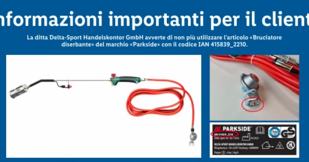 Interessati i bruciatori del marchio Parkside venduti dal 14.09.2023 e dal 18.04.2024 presso Aldi. Rimborso previsto alla restituzione.