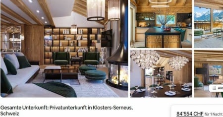 84'000 franchi per una notte in appartamento - Come il proprietario di una casa vacanza a Klosters-Serneus. Quattro camere da letto vengono via alla modica cifra di 84'554 franchi a notte. È l'offerta più cara su Airbnb. Gli ospiti godono certo un certo lusso: quattro bagni, una cucina completamente attrezzata e un ascensore privato.