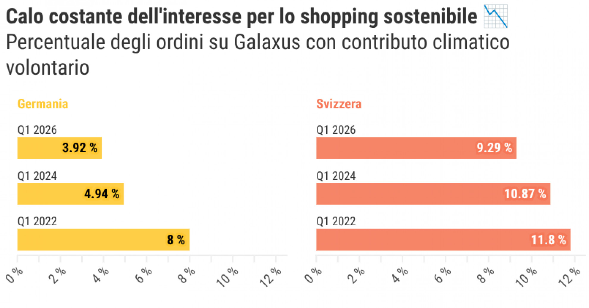 BERNA - L’interesse per lo shopping online rispettoso del clima continua a diminuire. Tanto che ha raggiunto un minimo storico presso Galaxus. Meno di una persona su dieci (9.26%), nel 2026, ha infatti pagato il contributo climatico volontario che si può aggiungere al proprio ordine, come comunica il colosso del commercio online. Nel 2022 questa cifra si attestava sfiorava invece il 12%.