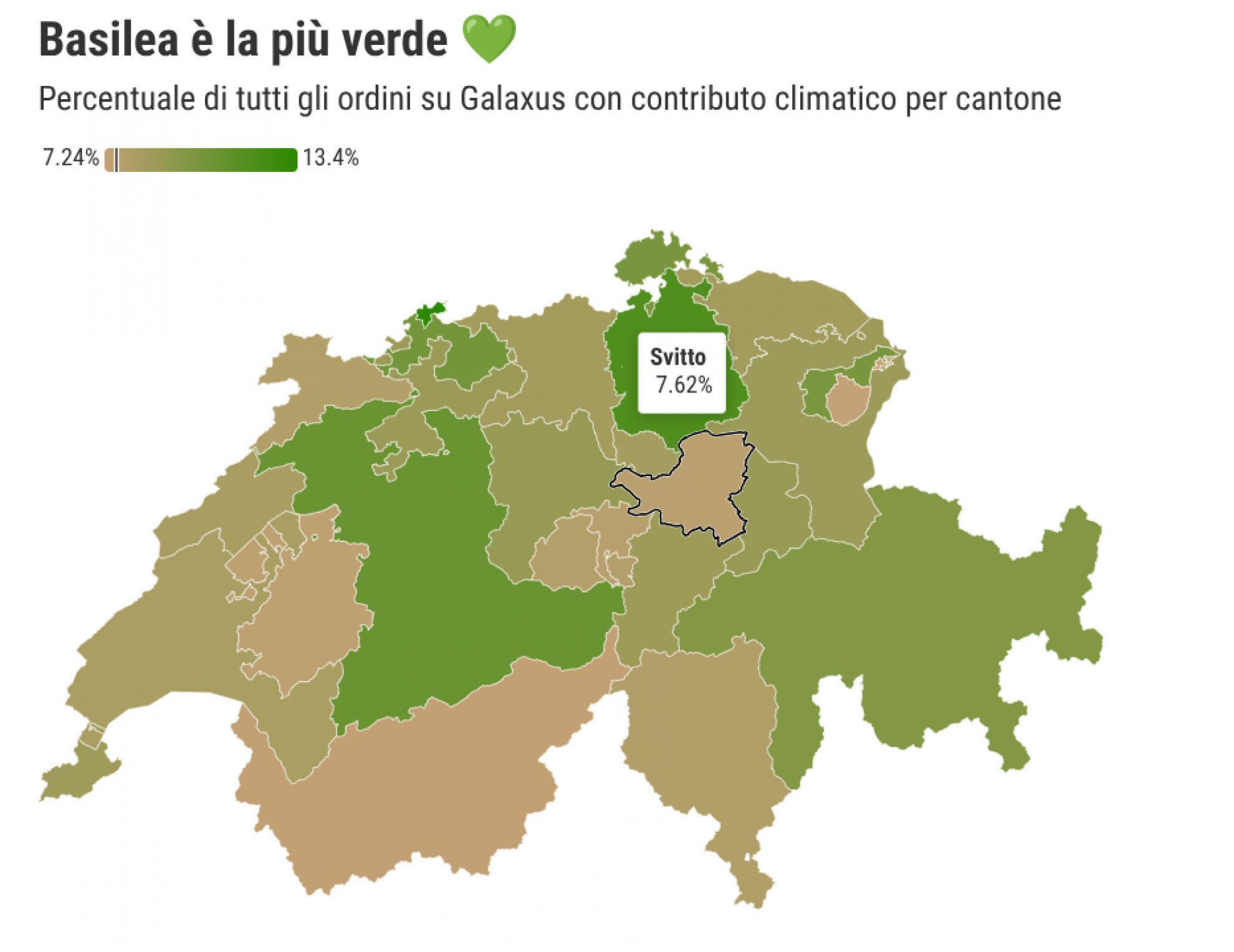 Tra i dati di Galaxus colpisce comunque il forte divario tra città e campagna: i grandi cantoni urbani di Basilea Città (13,4%), Zurigo (11,92%) e Berna (10,86%) risultano i più generosi per quanto riguarda il contributo climatico, mentre i cantoni a vocazione rurale come Appenzello Interno (7,24%), Vallese (7,37%) e Friburgo (7,53%) chiudono la classifica. Anche il Ticino, con un magro 8,01%, non si mostra particolarmente ambientalista.