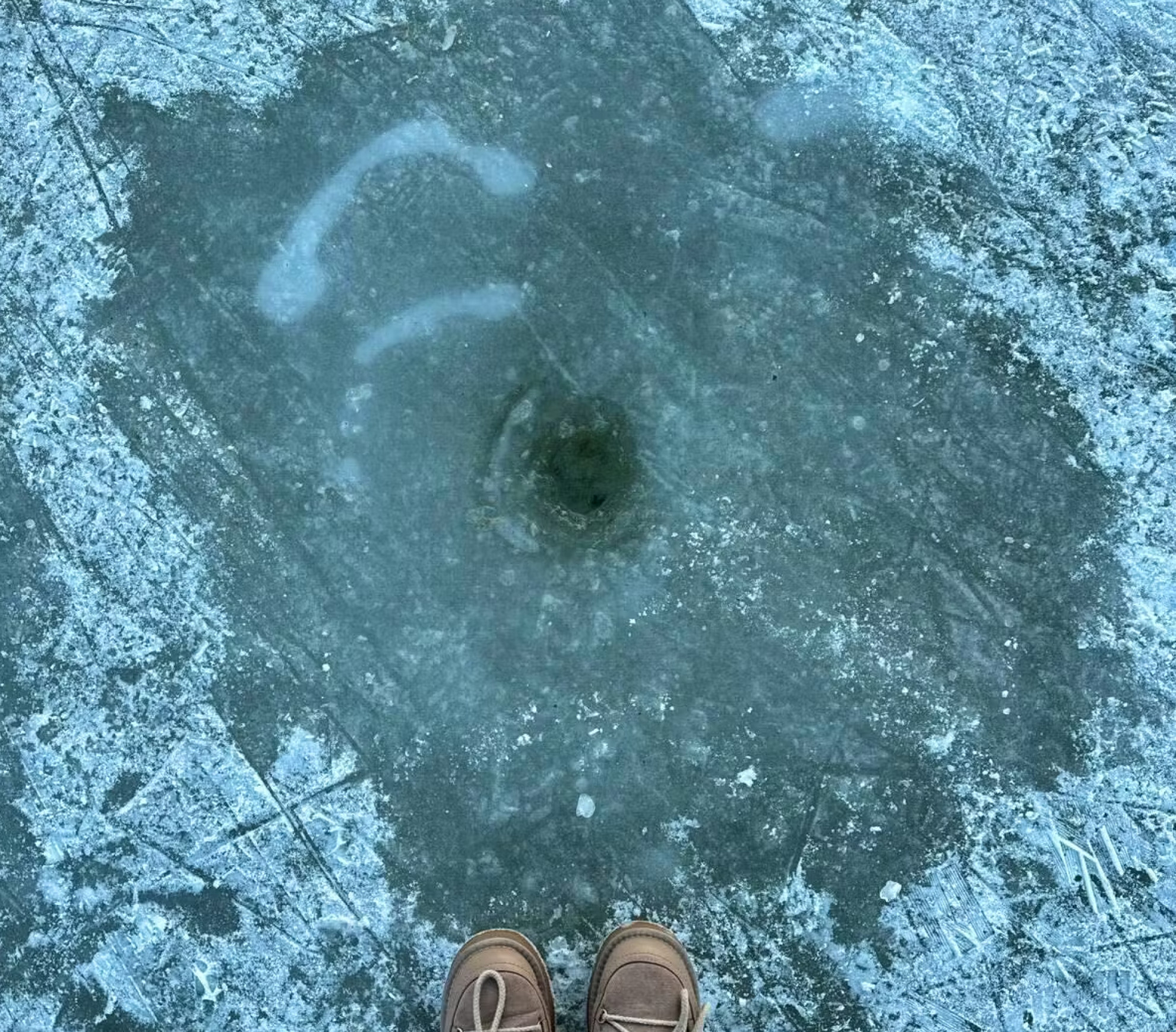 20min/Selina KellerUno dei segni di cedimento del ghiaccio.Qualcun altro si spaventa un po', sentendo il ghiaccio scricchiolare e cedere sotto gli scarponi: «Ti viene un brivido, è la natura che si fa sentire e che ti mette al tuo posto». Alcuni segni di cedimento della coperta ghiacciata sono visibili.