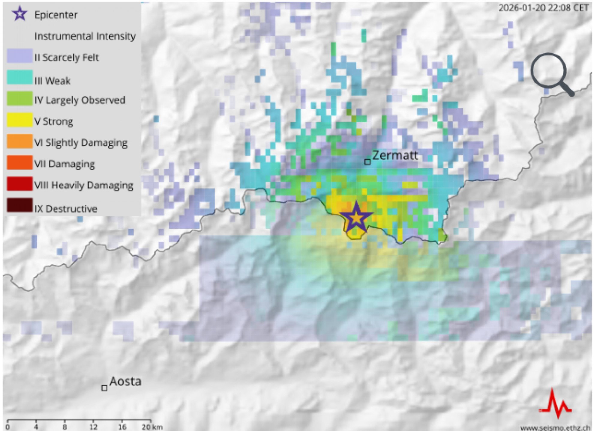 Il terremoto è stato registrato alle 21.21 a circa 9 km a sud di Zermatt, scrive il SED. Normalmente da una scossa di questa magnitudo non si attendono danni.