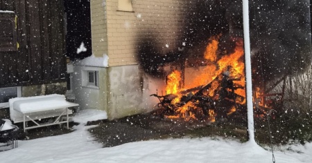 GLARONA SUD - Immagini surreali stamattina in canton Glarona con fiamme contornate da una coltre di neve bianca. L'incendio è scoppiato poco dopo le 9 nella località di Sool e ha colpito una casa di vacanza con annesso un fienile.