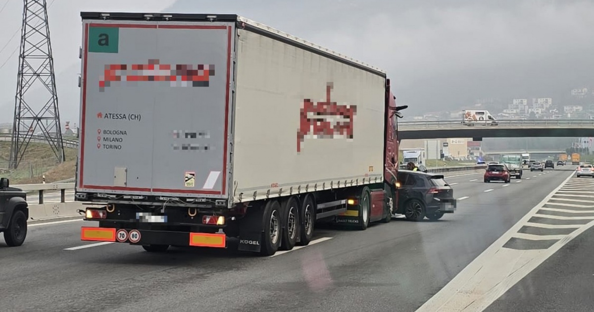 Scontro mattutino allo svincolo di Mendrisio, auto travolta da un tir