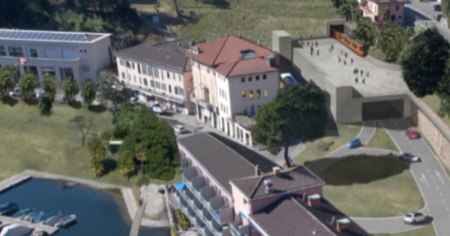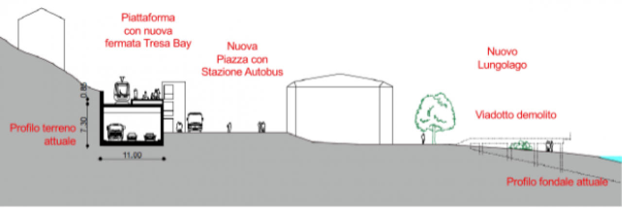 RenderingSezione capolinea e nodo d’interscambio (portale ovest).Addio viadotto - Il progetto prevede inoltre l'eliminazione del viadotto a lago costruito nel 1962, il ripristino del “quai” con il materiale proveniente dallo scavo delle gallerie e contestualmente la riorganizzazione di Piazza Municipio che sarà sede amministrativa del nuovo Comune Tresa. L'impianto doganale resterà quello attuale, mentre una passerella ciclo-pedonale permetterà all’utenza di lasciare il mezzo privato dalla parte italiana zona piazza mercato, dove è prevista l’edificazione di un autosilo con 500 posti auto.